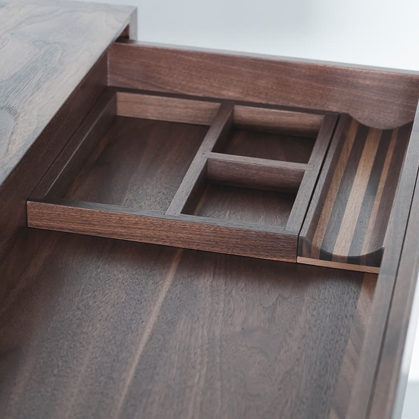 Minimalist design with revealed drawer mechanism - inspired by Young & Norgate. Finished with oil to accentuate the wood grain and protected with water-based varnish.