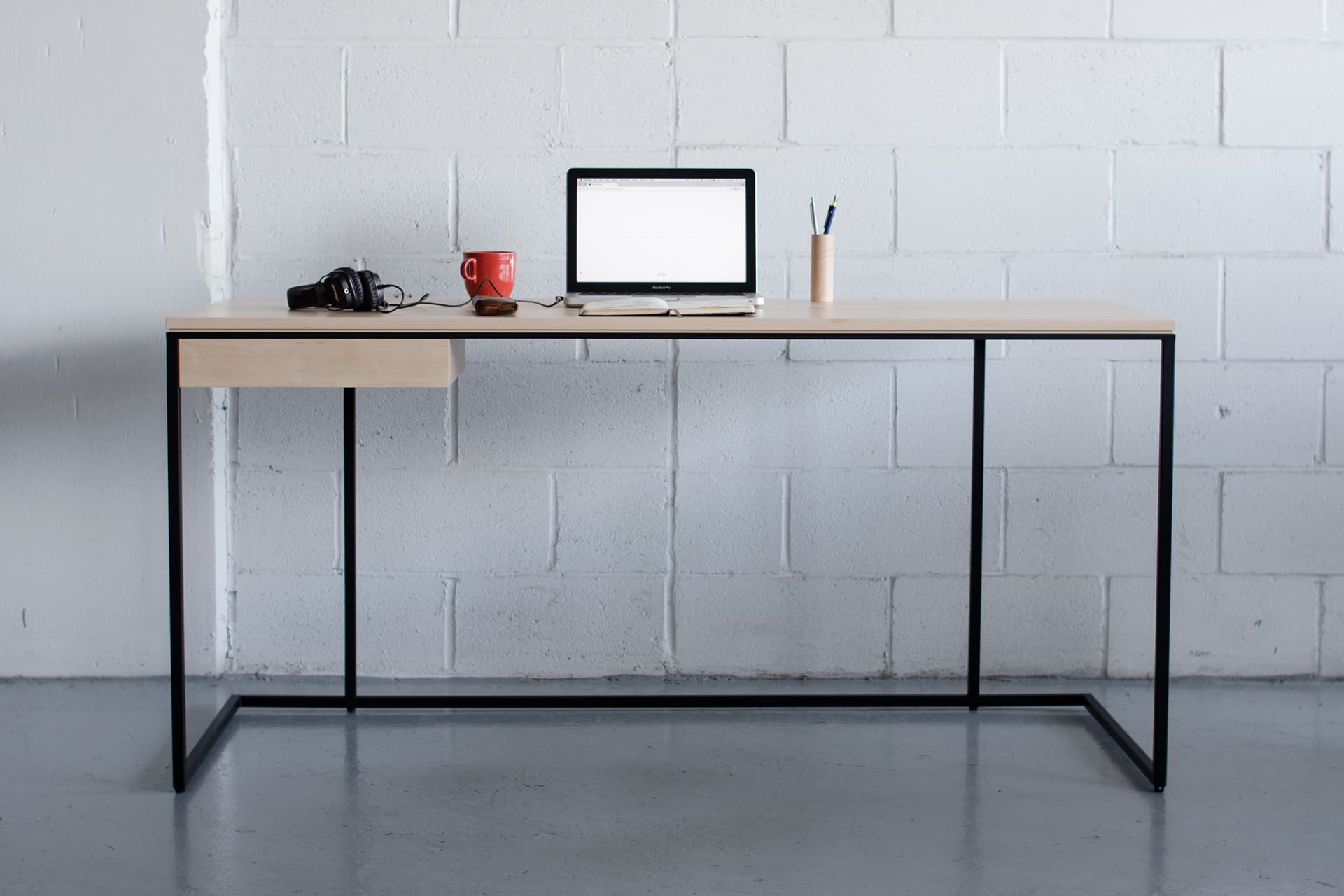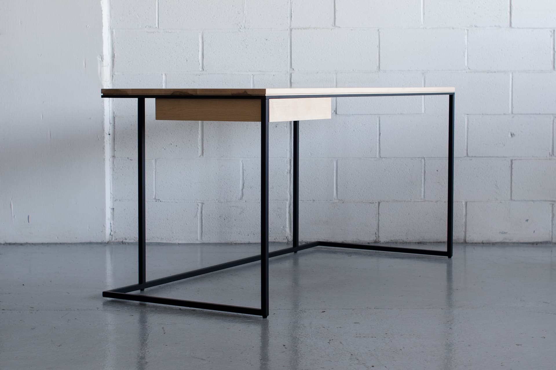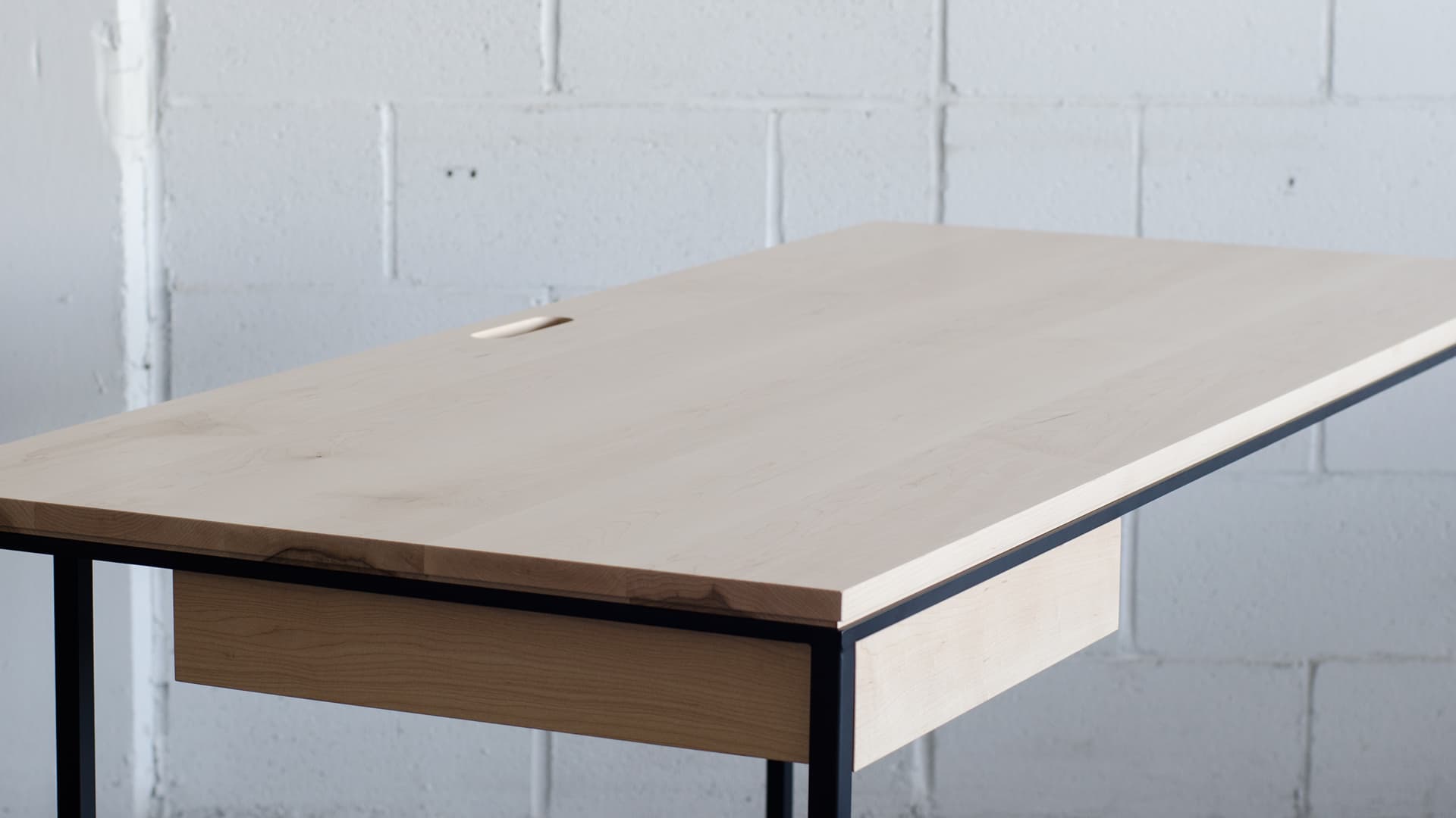 Sleek drawer for your most essential needs and a clutter-less work environment: height 1.125” x width 14.875” x depth 15.375”. Varnished maple and matte black powder coated steel base.